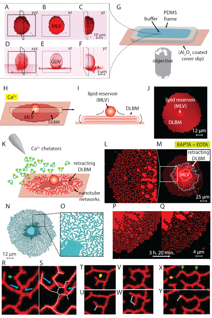 Solid-supported, protein-free, double phospholipid bilayer membranes (DLBM) can be transformed into complex and dynamic lipid nanotube networks and can serve as 2D bottom-up models of the endoplasmic reticulum.